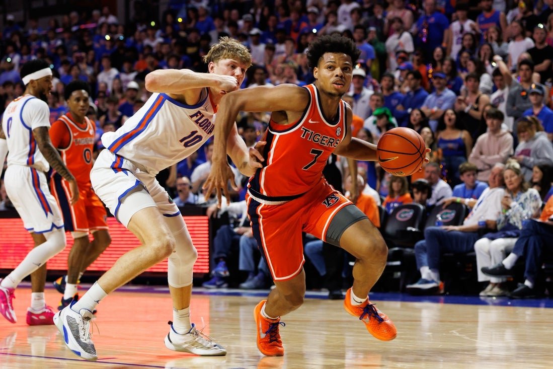 2026 年 1 月 24 日;蓋恩斯維爾,佛羅里達州,美國;在史蒂芬·C·奧康奈爾中心的 Exactech 競技場上半場,奧本老虎隊後衛基肖恩·霍爾 (Keyshawn Hall)(7 號)突破佛羅里達短吻鱷隊前鋒托馬斯·豪(Thomas Haugh)(10 號)入籃。強制性信用:Matt Pendleton-Imagn Images Keyshawn Hall得到24分,奧本週六在佛羅里達州蓋恩斯維爾以76-67擊敗鱷魚隊,結束了佛羅里達州第16名的五連勝。 KeShawn Murphy得到16分,Tahaad Pettiford得到11分,Kevin Overton為老虎隊得到10分(13-7、4-3秒),這是老虎隊第四次獲勝在五場比賽中。托馬斯·豪拿下27分和10個籃板,烏爾班·克拉夫扎爾拿下12分,魯本·欽耶盧也拿下10分,儘管他的7個籃板讓他距離鱷魚隊連續第五次獲得兩雙(14-6、5-2)。下半場開始,塞巴斯蒂安·威廉姆斯-亞當斯投中三分,奧本以46-28領先。佛羅里達隊在接下來的六分中得分,隨後伊利亞·弗里曼為老虎隊上籃回應。鱷魚隊打出一波7-0的高潮,將比分追至48-41,但奧本隊兩次將領先優勢重新擴大到9分。豪投中一個三分球,又投進一球,打出一波11-2的高潮,將比分扳平至54平。佩蒂福德的兩記跳投和奧弗頓的一記跳投讓老虎隊領先六分,比分再次打成56平。比賽還剩 2 分 48 秒時,欽萊尤的兩罰一中將佛羅里達隊的比分追至 4 分,但威廉姆斯-亞當斯和奧弗頓的連續投籃將領先優勢擴大了一倍。還剩 1 分 11 秒時,豪的三分球結束了鱷魚隊近八分鐘的投籃荒,此後鱷魚隊的分差不超過 5 分。霍爾拿下老虎隊的第一個10分,佩蒂福德由另一名奧本隊球員投中三分球為第一分,並上籃得分,奧本隊以19-5領先。布吉·弗蘭德(Boogie Fland)投進了鱷魚隊近三分鐘內的首個投籃,並將其轉變為三分球,克拉夫扎爾(Klavzar)和澤維安·李(Xaivian Lee)各投一記三分球,將佛羅里達隊以21-18追平。墨菲上籃得手,霍爾連得8分,打出一波10-1的高潮,將領先優勢擴大到12分。豪為鱷魚隊投中三分,但猛虎隊將領先優勢擴大到35-22。霍爾拿下上半場22分中的最後四分,幫助奧本半場以43-28領先。 –Field Level Media