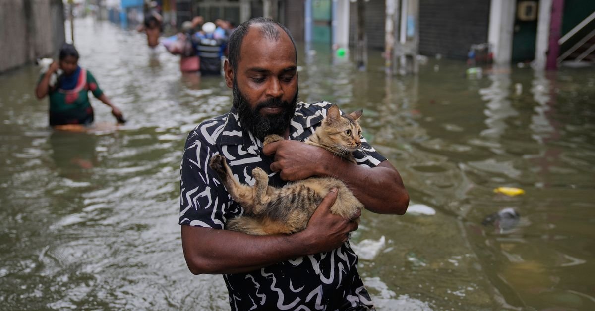 A man wades through a flooded road carrying a cat in Colombo, Sri Lanka, Saturday, Nov, 29, 2025. (AP)