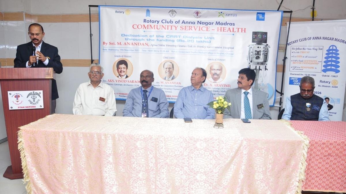 斯坦利政府醫學院醫院 (SMCH) 擁有連續腎臟替代療法 (CRRT) 透析室。該單位價值 200 萬盧比,由 Aptus Value Housing Finance Ltd 創始人兼執行主席 M. Anandan 根據其企業社會責任 (CSR) 提供資金。這一舉措是應馬德拉斯安娜納加爾扶輪社主席 P. Nandakumar 的請求,並根據 SMCH 院長 A. Aravind 和 SMCH 腎病科教授兼主任 M. Edwin Fernando 的呼籲而採取的。國際扶輪社 3234 區區長 Vinod Saraogi 出席。一份新聞稿稱,CRRT 部門將為無法耐受傳統透析的危重患者提供腎臟治療。發布 – 十一月 20, 2025 01:13 am IST