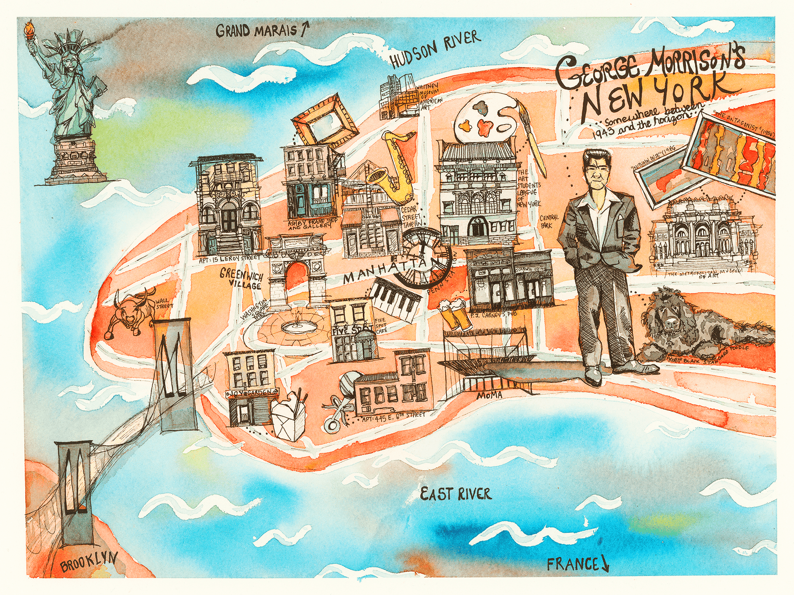 對於喬治·莫里森 (George Morrison) 來說,紐約是一座“神奇的城市”——與他在北岸奇珀瓦市 (Chippewa City) 出生的地方相去甚遠。這位廣受讚譽的明尼蘇達州奧及布威藝術家於 2000 年在大波蒂奇去世,以其抽像地平線繪畫和蘇必利爾湖拼貼畫而聞名,這些藝術品已成為該州形象的一部分。鮮為人知的是,莫里森年輕時在 20 世紀 40 年代在紐約學習藝術,並在他的一生中斷斷續續地生活在這座城市。這座城市塑造了莫里森,他與同行和朋友傑克遜·波洛克、威廉·德·庫寧、弗朗茨·克萊因、羅伯特·勞森伯格、路易絲·內維爾森和其他現代藝術巨擘一起,幫助塑造了來自紐約的 20 世紀主要藝術運動,如現代主義和抽象表現主義。美國最大的藝術博物館首次通過個展來表彰這些貢獻:大都會藝術博物館將在 2026 年 5 月 31 日之前舉辦“神奇之城:喬治·莫里森的紐約”。著名明尼蘇達州原住民藝術家喬治·莫里森將榮獲新郵票系列 MPR 新聞記者亞歷克斯·V·西波勒 (Alex V. Cipolle) 和梅麗莎·奧爾森 (Melissa Olson) 前往觀看展覽,並與家人、前伴侶和家人一起步行遊覽莫里森的紐約。喬治的獨子佈萊恩德·莫里森 (Briand Morrison) 說:“他實現了自己的夢想。他多次對我說過,去紐約是他最大的夢想,那裡是藝術的發源地,而他做到了。”賓夕法尼亞車站賓夕法尼亞車站亞歷克斯·V·西波勒 (Alex V. Cipolle) 插圖 1943 年 9 月,23 歲的喬治·莫里森 (George Morrison) 在賓夕法尼亞車站首次抵達紐約市。 “我乘坐火車,經濟艙。前往紐約對我來說是一件大事,”莫里森在他的傳記《轉動羽毛:我的藝術生涯》中說道。 “當火車到達賓州車站時,我可能已經檢查了我的棕色帽子和手提箱,或者我可能直接把它們帶到了藝術學生聯盟。”紐約藝術學生聯盟莫里森來到紐約在藝術學生聯盟學習,這得益於他以前的學校明尼阿波利斯藝術學院(現為明尼阿波利斯設計學院)以及聯盟本身的獎學金。藝術學生聯盟亞歷克斯·V·西波勒(Alex V. Cipolle)的插圖“其中一件有趣的事情“關於喬治·莫里森的最重要的一點是,他確實在 1943 年來到了聯盟,那是聯盟歷史上一個非常有趣的時刻,在這一時刻,學生群體真正變空了,”聯盟歷史學家兼檔案管理員斯蒂芬妮·卡西迪 (Stephanie Cassidy) 說道。莫里森的許多同齡人都曾應徵入伍參加第二次世界大戰,但莫里森無法參戰,因為他小時候在一所公立寄宿學校感染了髖部結核,導致永久性跛行。由於戰爭,莫里森也來到這座城市,恰逢藝術家們逃離歐洲來到紐約,藝術世界的中心發生了轉移。莫里森在聯盟老師喬治·格羅茲和莫里斯·坎特身上找到了導師;尤其是坎特的班級,成為抽象表現主義畫家的重要孵化器。正是在坎特的課堂上,莫里森創作了一幅名為《三個人物》的三角戀畫,該畫現在正在大都會藝術博物館展出。藝術家布魯斯·多爾夫曼(Bruce Dorfman)是聯盟任職時間最長的老師,他也在 1940 年代在聯盟學習,僅僅比莫里森晚了幾年。 “他是一位重要的藝術家,我很高興他受到關注,真的非常重要,”多夫曼在莫里森本來會上課的一間工作室裡教學時說道。多夫曼說,聯盟非傳統的開放結構鼓勵實驗,這會影響莫里森和其他未來的現代主義者和抽象表現主義者,他們開始拋棄傳統的、代表性的藝術風格。“從明尼阿波利斯跳到紐約,遇到像我這樣的激進學生,我覺得我們非常自由地做我們想做的事,”莫里森在他的傳記中談到加入聯盟時說道。 “我們總是去畫廊,繞城跑去博物館。我們會花一毛錢跳上地鐵或公共汽車,走遍整個城市。我們可以輕鬆地從聯盟乘坐公共汽車到大都會藝術博物館。 ”PJ Carney’s PubP.J.卡尼酒吧 (Carney’s Pub),亞歷克斯·V·西波勒 (Alex V. Cipolle) 插圖 酒吧經理 Philomena Coyne 表示,這家愛爾蘭酒吧的深色木質家具和舒適的氛圍在過去 100 年里基本保持不變。它仍然是藝術學生聯盟的學生和教師的中心,該聯盟就在拐角處。“我們都聚集在一起,喝點飲料,放鬆一下,因為畫了很長時間後,你會完全筋疲力盡,”我們在酒吧遇到的聯盟學生雪莉·喬伊說。莫里森在他的傳記中說坎特會帶學生去那裡。“放學後,我們經常去街角的卡尼酒吧。坎特喜歡和學生們一起吃飯。我們可以喝啤酒或任何我們想要的東西,”莫里森說。“然後我們會決定在曼哈頓的某個地方吃晚飯,這總是一件好事,”莫里森補充道。 “我們最喜歡的地方之一是唐人街。那是舊金山以外美國最好的中餐。 ” 喬伊花園 喬伊花園 插圖由亞歷克斯·V·西波勒 (Alex V. Cipolle) 繪製 在她第一次與莫里森一起去紐約時,黑茲爾·貝爾沃說他帶她去了唐人街的喬伊花園粵菜餐廳,“那裡聚集了許多藝術家。 ”布萊恩德·莫里森說,“這是我們經常去的餐廳。 ” 格林威治村 莫里森年輕時住在格林威治周圍的許多公寓裡村莊,包括勒羅伊街 15 號,這是他在紐約的第一個住宅。勒羅伊街 15 號公寓由 Alex V. Cipolle 繪製“這是一棟小而可愛的建築,大約有五層樓高,對我來說,它看起來就像是典型的紐約公寓,”喬治·莫里森和黑澤爾·貝爾沃的獨子佈萊恩德·莫里森說。 1960 年代 Briand 出生後,貝爾沃和莫里森也住在其他社區,比如東村東第六街 445 號的一套公寓。Briand 和合夥人 Roxanne 以及他們的孩子和孫子前往紐約觀看展覽。這是他們第一次來到公寓,也是徒步旅行中的許多景點。“我很高興看到這裡的所有
