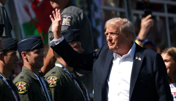 美國總統唐納德·特朗普(Donald Trump)在比賽的第一天到達了佩薩巴格·布萊克(Pithabag Black)的騎手杯比賽的第一天,揮舞著人群。 (Brendan McDdedide/Reuters通過Imagn照片)