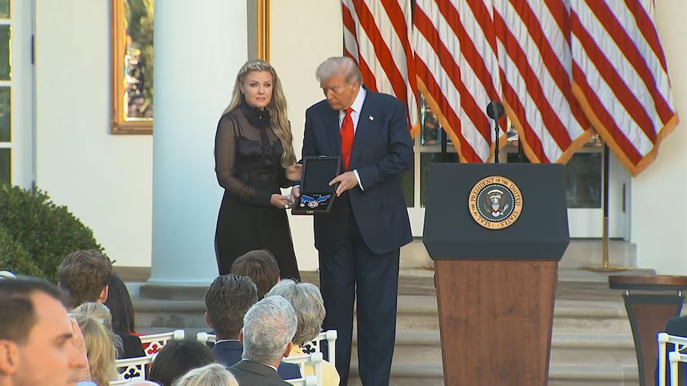 埃里卡·柯克在查理·柯克的自由勳章儀式上發表講話 週二,特朗普總統追授保守派活動家查理·柯克國家最高平民榮譽——總統自由勳章,並將該勳章頒發給他的遺孀埃里卡·柯克。十月 15, 2025