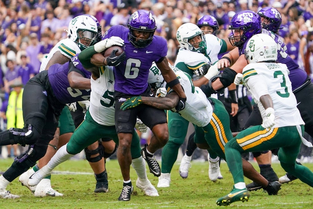 2025 年 10 月 18 日;美國德克薩斯州沃思堡; TCU Horned Frogs 跑衛特倫特·巴特爾 (Trent Battle)(6 歲)在阿蒙 J 卡特體育場的上半場比賽中被貝勒熊隊線衛馬修·福布斯-懷特 (Matthew Fobbs-White,50 歲) 和線衛凱蘭·里德 (Kyland Reed,45 歲) 擊中。強制鏈接:Raymond Carlin III-Imagn Images 約什·胡佛 (Josh Hoover) 傳球 231 碼和 3 次達陣,但 TCU 的防守發揮了作用,角蛙隊於週六下午在沃斯堡舉行的一場重要的 Big 12 Conference 比賽中以 42-36 擊敗對手貝勒大學。德克薩斯州。 TCU(5-2、2-2 Big 12)在第四節經歷了三次閃電般的延誤,並在貝勒大學後期的進攻中倖存下來,在分區競賽中重回正軌。胡佛完成了 31 次傳球中的 22 次,角蛙隊的防守攔截了貝勒四分衛索耶·羅伯遜(週六進入 FBS 傳球碼數領先者)3 次,抵消了他的 318 傳球碼數。 Kevorian Barnes 衝球 106 碼併兩次達陣,其中包括在第三次閃電戰後第一回合中線 14 碼衝刺,將 TCU 的領先優勢擴大到 42-21。貝勒(4-3、2-2)在比賽中出現了五次失誤中的四次。羅伯遜兩次達陣,但在比賽還剩 11 秒時熊隊追回越位球後,他的第三次被攔截。熊隊率先發起進攻,移動 92 碼,由布萊森·華盛頓 (Bryson Washington) 跑動 1 碼得分。第二節開場四分鐘,胡佛接到DJ羅傑斯的8碼傳球回敬,TCU將比分追成7平。在華盛頓隊失球後,巴恩斯從5碼外衝入達陣區,在半場結束前6分10秒時,TCU以14-7領先。在本節還剩 2 分 04 秒時,康納·霍金斯 (Connor Hawkins) 踢出一記 42 碼射門,將熊隊的比分追至 14-10。半場還剩 11 秒時,胡佛向喬丹·德懷爾 (Jordan Dwyer) 傳出 6 碼傳球,兩人連線 41 碼後,僅三秒就將比分改寫為 21-10。第三節開始時,TCU 將領先優勢擴大到 28-10,Hoover 向 Ka’Morreun Pimpton 傳出 3 碼達陣傳球。但熊隊在下半場第一次控球時就以得分回應,羅伯遜找到傑登·波特(Jadon Porter) 18碼傳球,並給約什·卡梅倫(Josh Cameron)傳出兩分球,將比分追至28-18。霍金斯在第四節第一節比賽中踢出一記 41 碼射門,將貝勒大學的落後優勢縮小到 7 分。當特倫特·巴特爾(Trent Battle)跑出 65 碼未受影響時,角蛙隊撤退,給了他們一些喘息的空間。隨後,由於天氣原因,巴恩斯的 14 碼達陣衝球最終幫助球隊贏得了比賽的製勝分。比賽還剩 3 分 08 秒時,基頓·托馬斯 (Keaton Thomas) 在胡佛掉球後 24 碼接球,科爾·威爾遜 (Kol Wilson) 在比賽還剩 30 秒時接球 35 碼達陣,讓貝勒晚年。 –領域級媒體