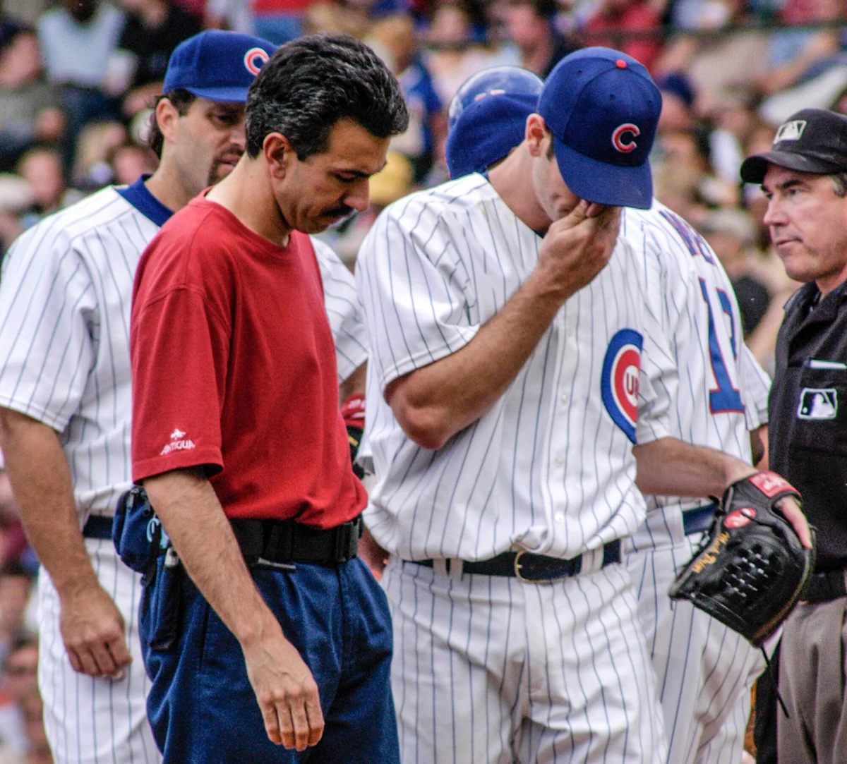 這是 BCB 讀者克拉克·艾迪生 (Clark Addison) 提供的另一張照片。 如您所知,馬克·普賴爾 (Mark Prior) 遭受了兩次重傷,最終結束了他的 MLB 職業生涯。 第一個是在壘道上與勇士隊的馬庫斯·賈爾斯 (Marcus Giles) 相撞。這發生在2003年7月11日第二局下半時,普萊爾保送後。這場比賽是這樣的:第二個是當普萊爾的投球肘部被落基山脈隊的布拉德·霍普擊中時,直線擊球擊中了他。這件事發生在 2005 年 5 月 27 日的第四局上半。順便說一句,那場比賽變成了出局,小熊隊三壘手阿拉米斯·拉米雷斯 (Aramis Ramirez) 接住了球,正如棒球參考鏈接所示:犯規爭邊球:P-3B(3B 進入犯規球)。因此,普萊爾在這場比賽中得到了一次助攻,儘管他在比賽中痛苦地扭動著。這是那齣戲:這又是照片。因此乍一看,這似乎不是來自這些事件中的任何一個。普賴爾與賈爾斯相撞時正在底路上,因此他不會戴手套。正如你在霍普比賽的視頻中看到的那樣,那天天氣晴朗,所以與照片不符。關鍵是:在吉爾斯碰撞後,普賴爾並沒有離開比賽。他又投了近三局,最終在第五局上半局以兩分出局的成績離開,當時他讓安德魯·瓊斯打出兩分本壘打,保送羅伯特·菲克。這就是我們在這張照片中看到的內容,拍攝時間是 2003 年 7 月 11 日星期五。小熊隊以 9-5 輸掉了比賽。照片中其他可辨認的人物是當天的一壘手埃里克·卡羅斯(Eric Karros)(左)、訓練師戴夫·通巴斯(Dave Tumbas)和當天下午負責本壘板的裁判邁克·溫特斯(Mike Winters)。關於2005年的傷病,我確信這與普賴爾後來的肩部問題有很大關係。為什麼?因為當傷病發生時,許多人認為這即使不會威脅到職業生涯,也會導致賽季結束。但普賴爾在四個星期後又回到了投手丘。我認為他回來得太早了,也許巧妙地改變了他的動作,導致了他的肩膀問題。在那次受傷之前,他從未有過任何肩膀問題,事實上,在 2003 年受傷後,他在 2003 年剩下的時間裡投得非常好。最後,對於那些仍然認為達斯蒂·貝克因過度使用而毀掉了普萊爾的人來說,普萊爾根本不相信這一點。我想我沒有讀過普賴爾在 2016 年發表在《體育畫報》上的這篇文章——我懷疑那一年我正忙著思考其他事情——但在這篇文章中,他完全免除了貝克的任何責任(強調在原文中):即使是現在,當人們聽到我的名字時,他們仍然會想到炒作和潛力。而且,不可避免地還有傷病。好吧,我們來談談吧。有些人指出了我的傳球和手臂動作的問題。其他人——主要是小熊隊的球迷——仍然指責我的經理達斯蒂·貝克,因為一系列傷病使我的職業生涯脫軌。他們認為他在 2003 年過度使用了我,等等等等。只是,事情是這樣的:我不會因為發生在我身上的事情而責怪達斯蒂。我不會改變那個賽季發生的任何一件事——當然,除了我們未能將世界大賽冠軍帶到芝加哥之外。無論我投了多少球,我從來沒有要求退出一場比賽——這樣做是不可想像的。達斯蒂被聘請來管理每場比賽,就像這是他的最後一場比賽一樣。在一個賽季(甚至多個賽季)的過程中,這意味著一系列無休止的決策——尤其是在平衡投手工作量和贏得比賽的需要方面。具有諷刺意味的是,這是我現在在教士隊工作的一部分——我們所有附屬機構的投手教練的工作——而且這不是一件容易的事。就像其他事情一樣,你會盡力而為。我相信達斯蒂已盡力而為,而任何認為他應對我或克里伍德發生的事情負責的人,我都會強烈反對。所以,讓我們把所有對達斯蒂的指責都拋在一邊。事實上,貝克可以被指責在 2003 年 NLCS 第六場“事件”之後袖手旁觀,無所事事。但在我看來,普萊爾和克里伍德都擁有名人堂天賦,他們的遭遇只是運氣不好,受到了各種傷病的影響。從各方面來看,普萊爾現在作為道奇隊的投手教練做得很好,他自 2020 年以來一直擔任這份工作。祝他一切順利。