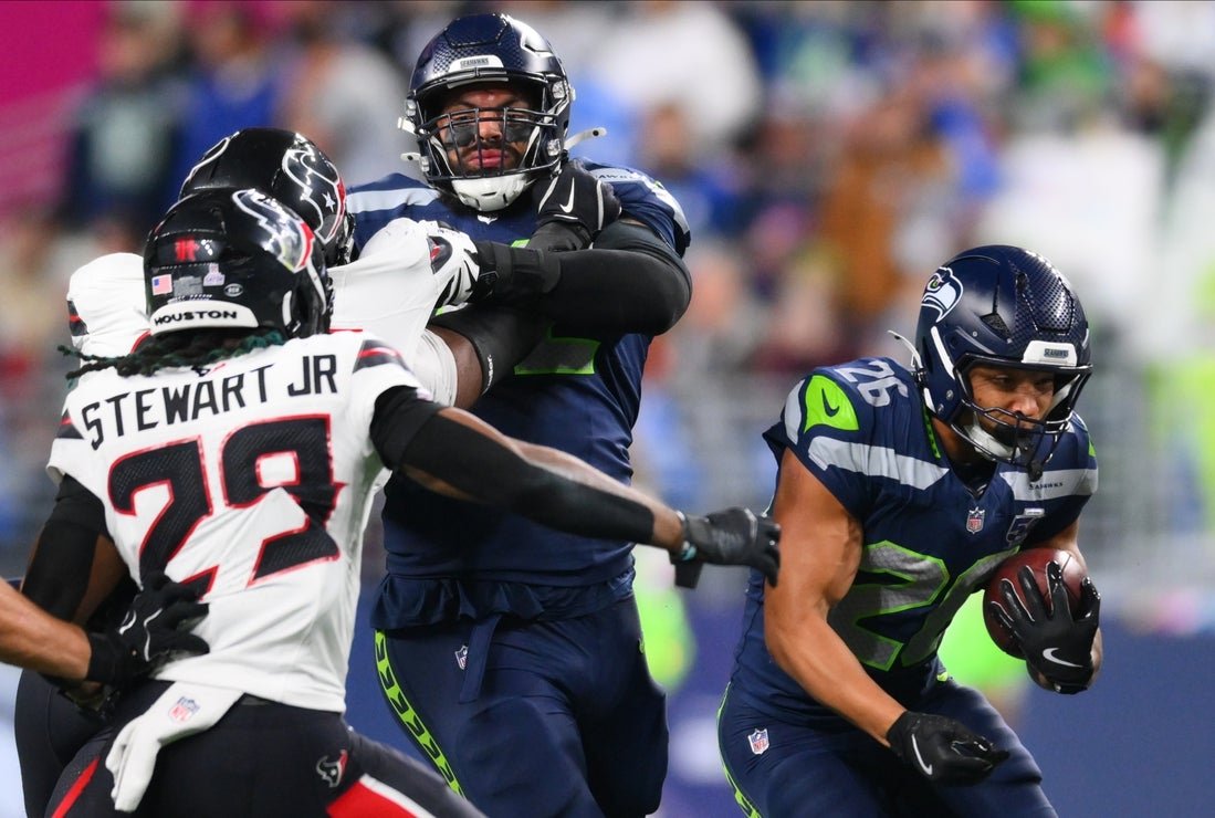 2025 年 10 月 20 日;美國華盛頓州西雅圖;西雅圖海鷹隊跑衛扎克·查博內特(Zach Charbonnet,26 歲)在魯門球場對陣休斯頓德州人隊的第一節比賽中帶球跑動。強制鏈接:Steven Bisig-Imagn 圖片 週一晚上,西雅圖海鷹隊 (Seattle Seahawks) 以 27-19 擊敗來訪的休斯敦德州人隊 (Houston Texans),扎克·夏邦內 (Zach Charbonnet) 在兩次短跑中得分。傑克遜·史密斯-恩吉巴連續第三次完成 100 碼接球比賽(8 次接球,123 碼),並在薩姆·達諾德 (Sam Darnold) 傳球中得分,幫助海鷹隊 (5-2) 在 NFC 西部對陣舊金山 49 人隊和洛杉磯公羊隊的比賽中排名第一。比賽還剩 2 分 04 秒時,C.J. 斯特勞德 (C.J. Stroud) 向跑衛伍迪·馬克斯 (Woody Marks) 傳出 4 碼傳球,為德州人隊 (2-4) 唯一一次進攻達陣,但超音速隊已經耗盡了時間。斯特勞德 49 次傳球完成 23 次,推進 229 碼,1 次達陣和 1 次攔截。他還兩次嘗試衝球 25 碼,領先德州人隊。近端鋒道爾頓·舒爾茨 (Dalton Schultz) 9 次接球推進 98 碼。達諾德31投17中,推進213碼,1次傳球1次攔截。肯尼思·沃克三世 (Kenneth Walker III) 17 次沖球推進 66 碼,查博內特 (Charbonnet) 12 次沖球推進 49 碼。首節海鷹隊以14-0領先。本節還剩 7 分 28 秒時,查博內特 (Charbonnet) 衝球 1 碼得分,史密斯-尼吉巴 (Smith-Njigba) 在本節最後一場比賽中命中了達諾德 (Darnold) 的 11 碼衝球。海鷹隊在第二節末有兩次擴大領先優勢的機會。第一個進球因外接手庫珀·庫普 (Cooper Kupp) 攔截球而受阻,第二個進球因傑森·邁爾斯 (Jason Myers) 的 53 碼射門被德尼科·奧特里 (Denico Autry) 擋出而受阻。休斯頓隊的凱米·費爾貝恩 (Kaimi Fairbairn) 在半場最後 2 分 18 秒分別踢出 36 碼和 46 碼的射門,將比分改寫為 14-6。下半場第一個回合,歐內斯特·瓊斯四世就接過斯特勞德,邁爾斯在26碼外踢球,將領先優勢擴大到17-6。第三節比賽還剩 7 分 24 秒時,小威爾·安德森 (Will Anderson Jr.) 擊中達諾德 (Darnold) 並在達諾德 (Darnold) 達諾德 (Darnold) 失球後恢復,將比分追至 17-12。德州人嘗試兩分轉換,但斯特勞德在達陣區最右角向近端鋒道爾頓·舒爾茨的傳球未完成。第三節還剩5分15秒時邁爾斯的47碼投籃將比分改寫為20-12。第三節還剩 54 秒時,查博內特在 2 碼外得分,西雅圖隊以 27-12 領先。 –領域級媒體