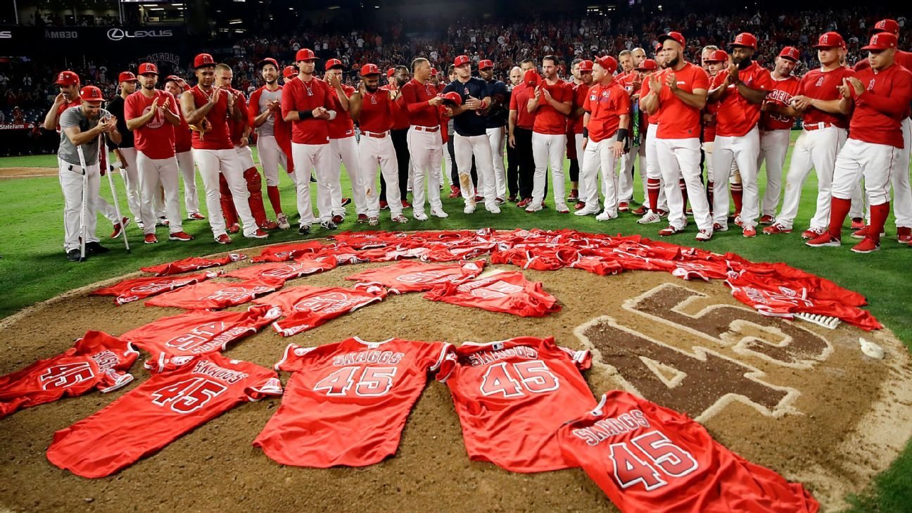 Angels team members place on the mound jerseys with No. 45 in honor of pitcher Tyler Skaggs after his 2019 overdose death. AP Photo/Marcio Jose Sanchez